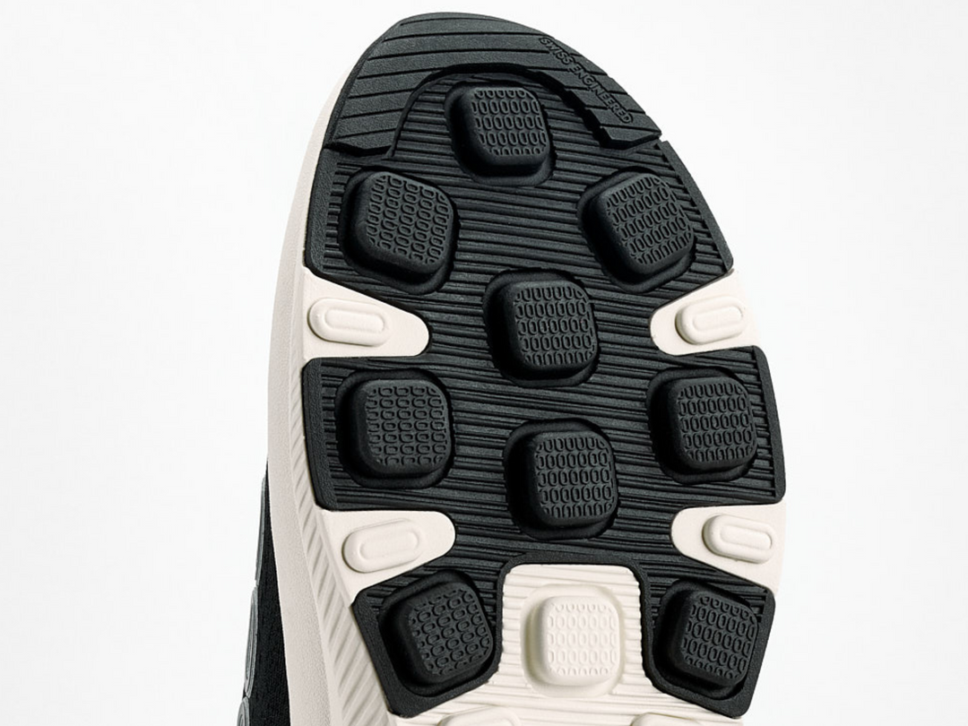 • Aussensohle: Zweikomponenten-Konstruktion mit EVA-Zwischensohle und einer Aussensohle, die teilweise aus vorverbrauchtem recyceltem Gummi besteht.