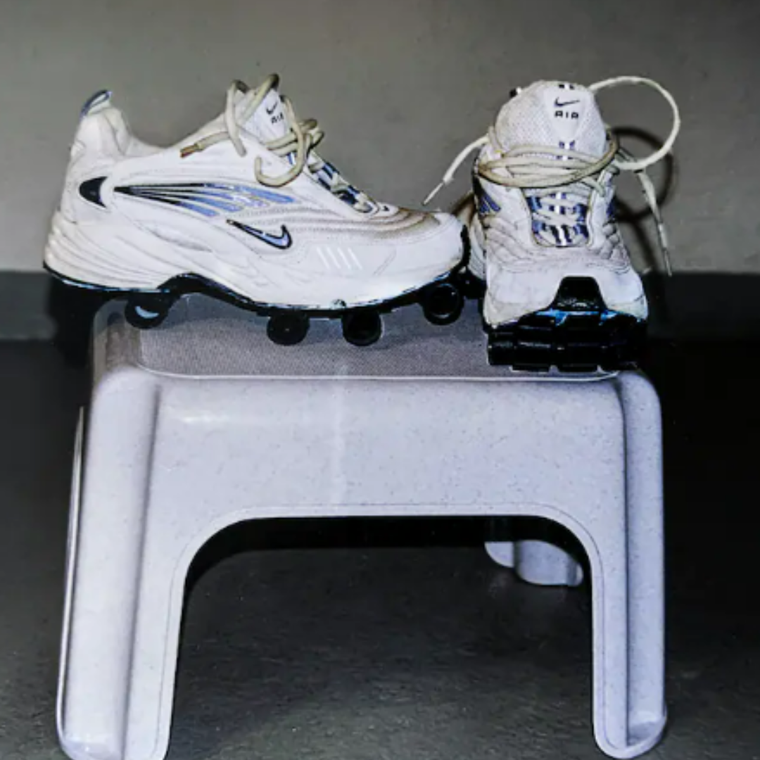 Ausgestattet mit einem Gartenschlauch, einer Schere und etwas Sekundenkleber bastelte Jürg seinen Prototyp. Er schnitt den Gartenschlauch in 13 Stücke und klebte sie auf die Sohle seiner Schuhe. Die Gummischläuche scheren und brechen beim Aufprall zusammen, bleiben aber fest und stabil für den Abstoss.