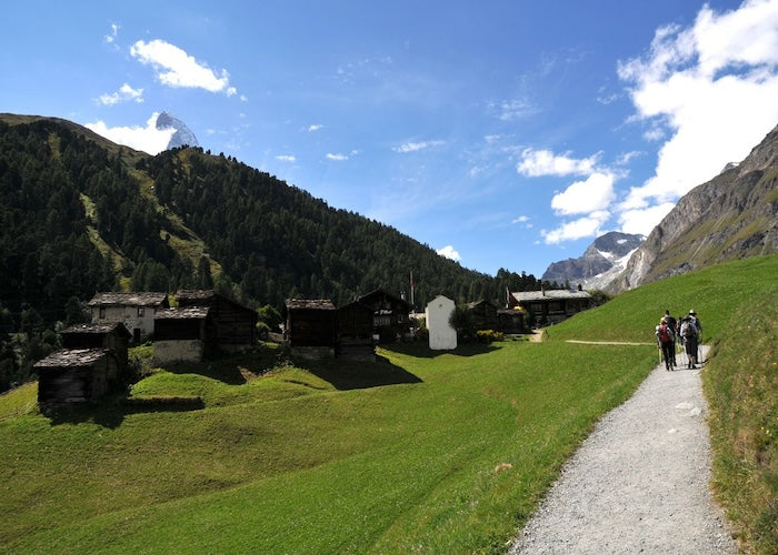Geniesse eine gemütliche Wanderung von Zermatt zum charmanten Weiler Zmutt. Mit dem majestätischen Matterhorn im Hintergrund bietet dieser Weg eine Mischung aus atemberaubender Landschaft und traditionellem Schweizer Charme.