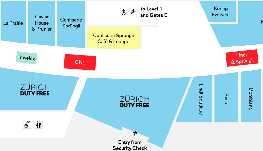 Nach dem Security Check, nimm die Rolltreppe ins Level 2. Wir sind direkt neben Sprüngli und leicht zu erkennen. Wir freuen uns auf deinen Besuch!